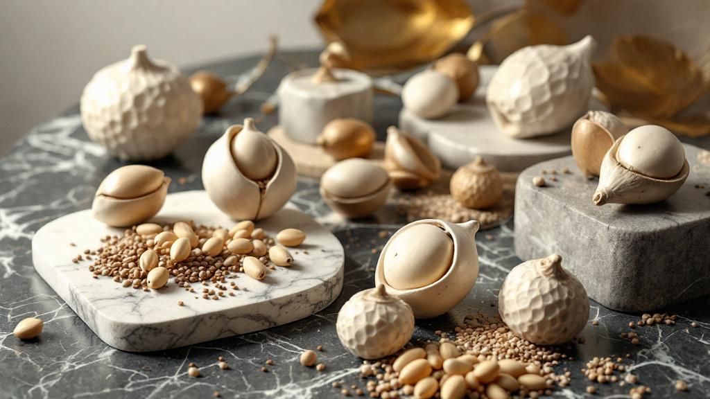 - Ceramic cocoa pods and bronze magnolia seeds convey narratives with directness and confidence